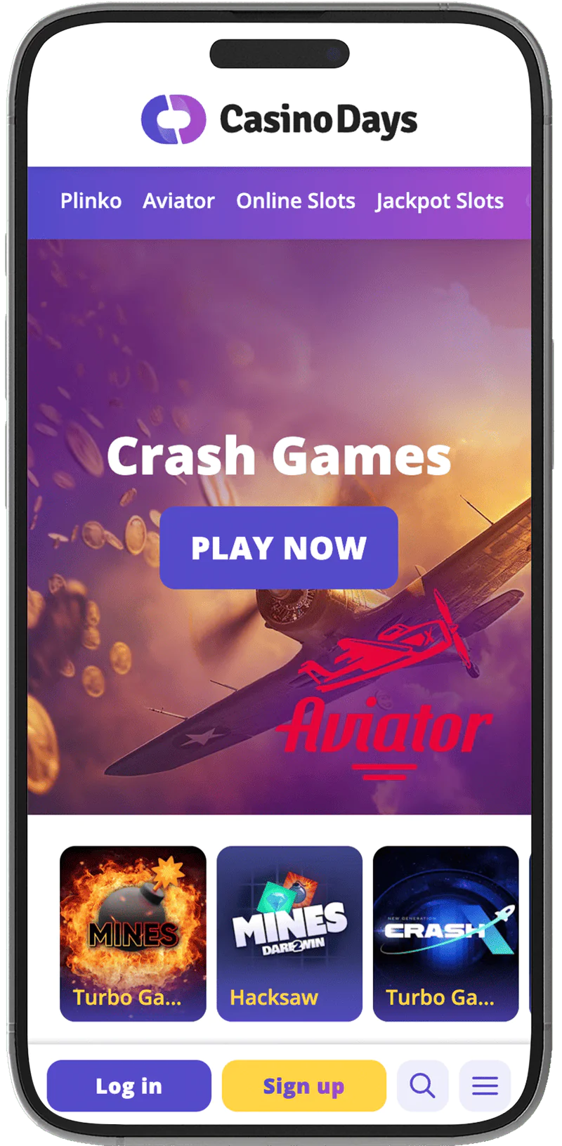The Casino Days Aviator game app has a design that adapts to the parameters of the gadget. A light color scheme with purple inserts and colorful banners is implemented. After conducting tests we can say that the functionality is intuitive, as there is a handy menu with categories Casino, Live, Promotions, and Help.