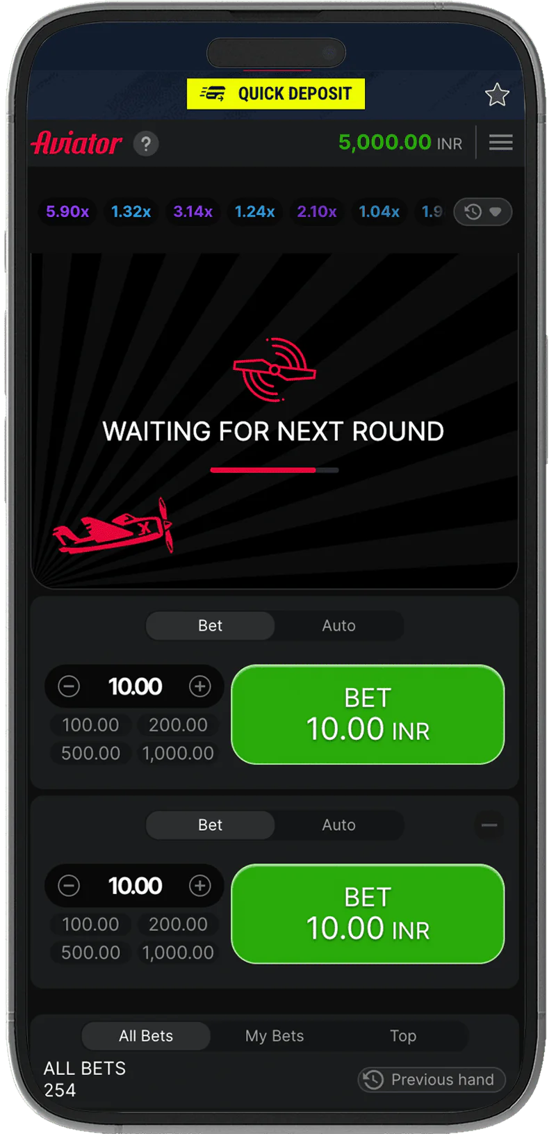 Set the size of one or two bets using the field at the bottom. Confirm the bet and wait for the start of the game round.